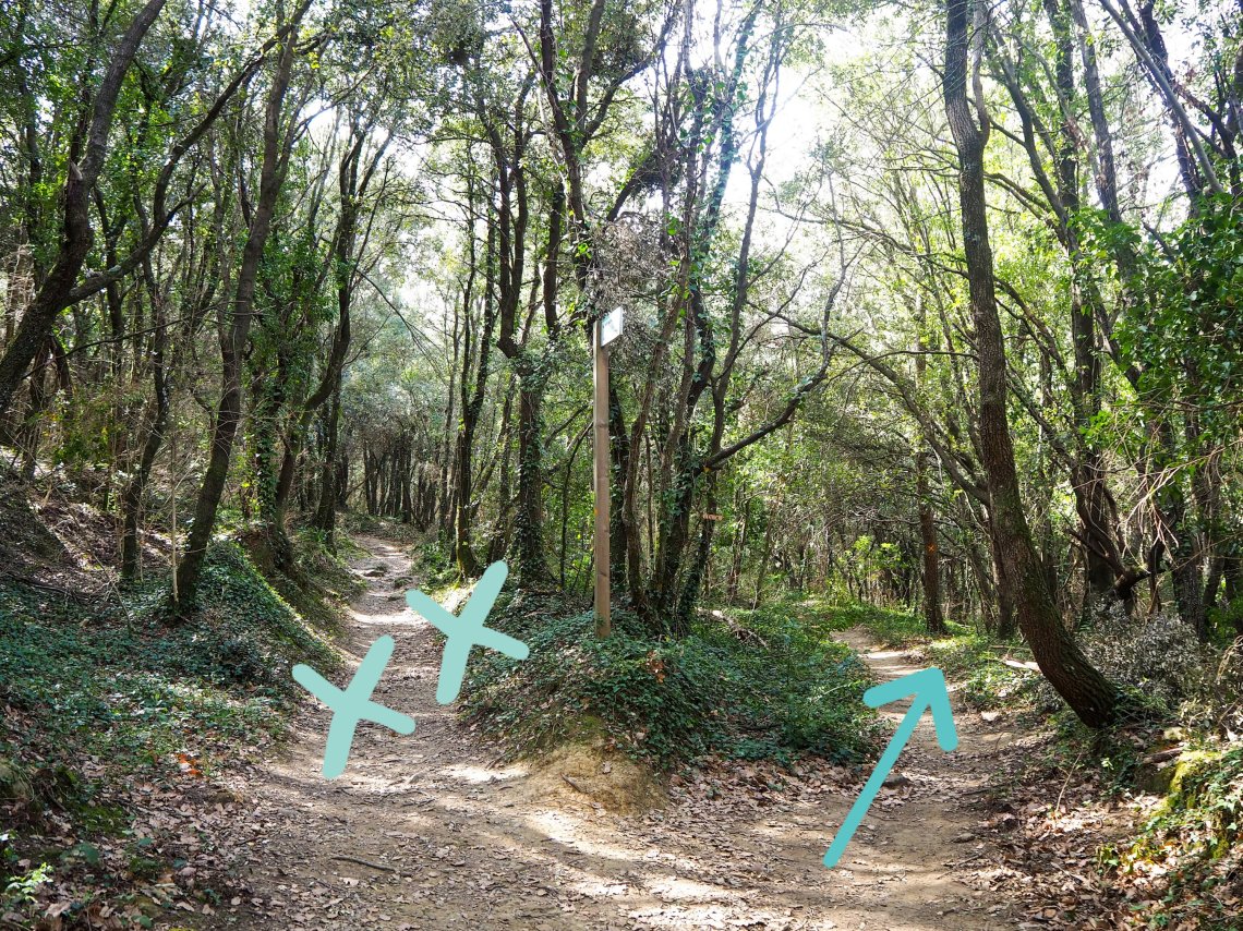 Justo al pasar la casa rural, veremos un cartel que indica Cami Ral de Vic a Olot, tomamos el camino de la derecha que indica hacia Vic.